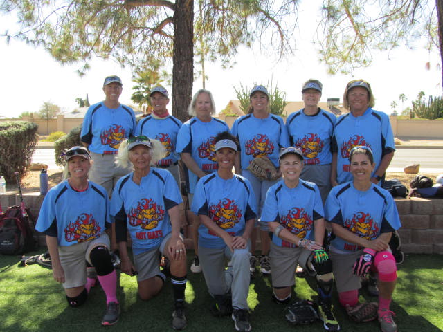 After a slow start by both the Sun City West Hot Flashes and Grand Diamonds-Hot Bats teams, the hits and runs finally began. The Grand women held West to 6 scoreless innings with defense that was stellar. One fan was overheard to say that in his next life he wanted to come back with Lisa Pelletier’s defensive skills. Lisa was everywhere today and even caught an improbable, impossible ball deflected off another glove for the put out. Today’s team effort: A foul tip catch by Yvonne Becker, catches by Kathy Boland, Ardy Robertson, Becky Holliday and Karen Olsen covering the middle. Offensive moves by our base runners to get themselves into scoring position, taking that extra base. Perfect at the plate today: Becky Holliday and Kathy Boland RBI. Other hitters: Yvonne Becker RBI, Ardy Robertson, Vicki Hanson RBI, Wendy Denzel, Lisa Pelletier 2 RBIs, Laura Fenton-Kovanda 1 RBI and Annie Lowe. 19 hits in all for the 8-3 win. THANK YOU to base coaches Claire Lucas and Cheri Swinehart, Scorebook-Susie Tornes, Patti Jones-Bernhardt working the scoreboard, Mike Wunsch and Roger Neumann MC and DJ, umpires - Marilyn Leinberger and Dave Michels and Norm Lustig for the special paint on the foul lines. Howard Sumner for the action photos. Thank you to all the fans in the stands and on the grass on Home Run Dr.